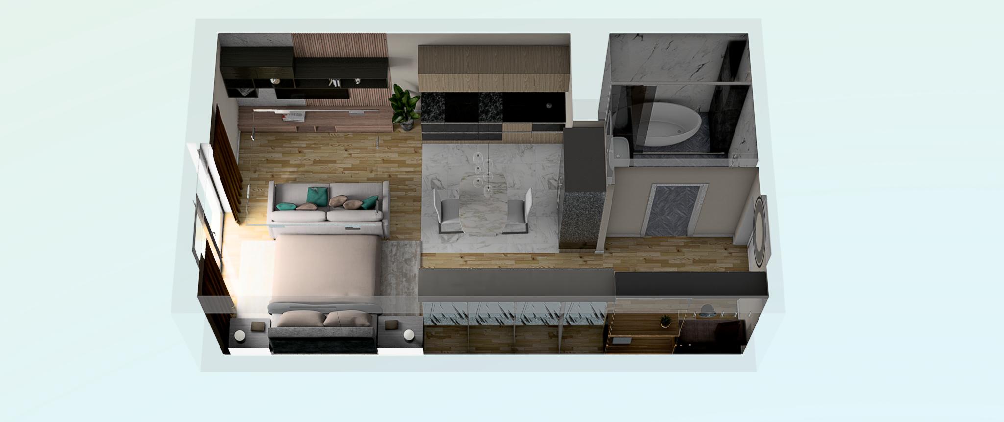 Це сучасний підхід до організації житлового простору, який відмовляється від традиційного поділу на окремі кімнати. У таких квартирах кухня, вітальня, їдальня або робочий куточок поєднуються в єдиний відкритий простір. Головна ідея концепції — створення легкого, світлого та комфортного середовища, де кожна зона плавно переходить одна в одну.