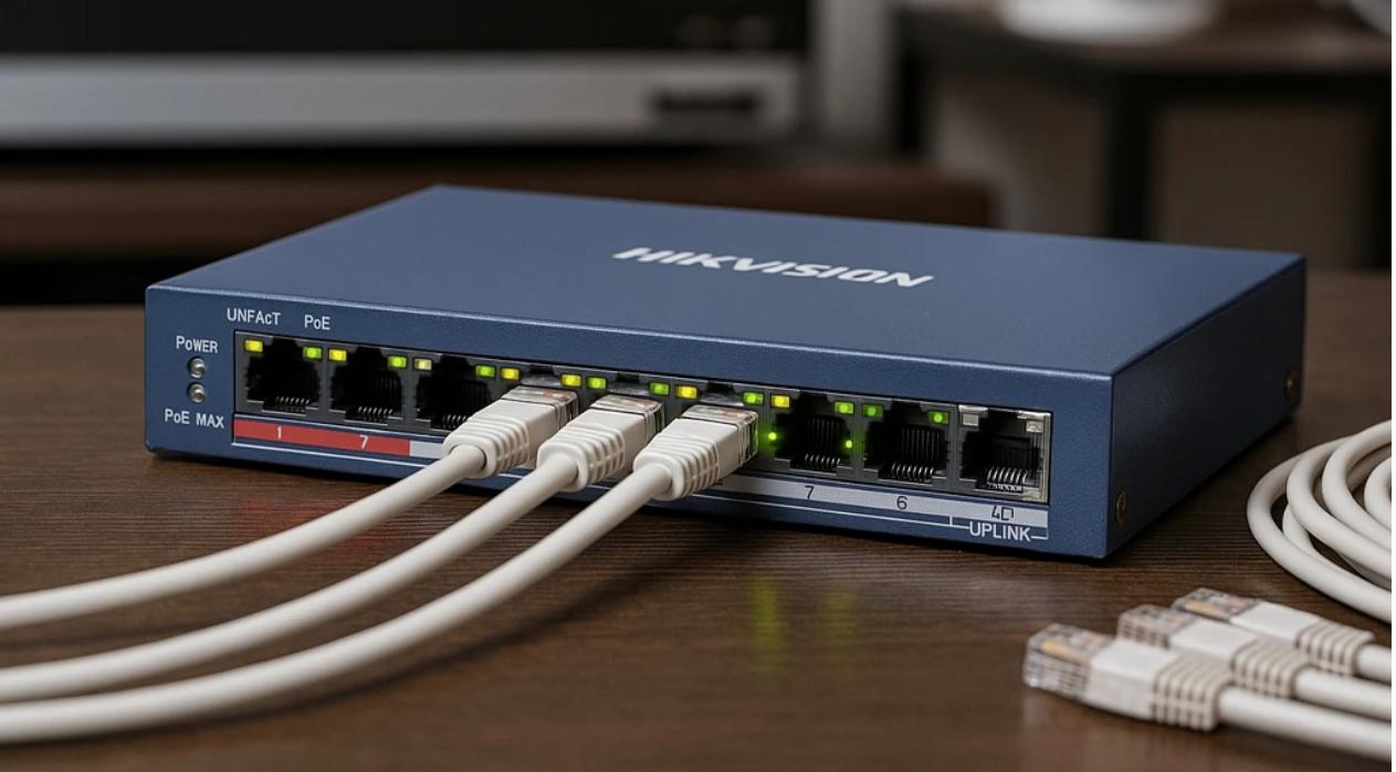Коммутатор (switch) — это сетевое устройство, которое объединяет IP-камеры и регистраторы в единую сеть, распределяет трафик и обеспечивает питание через PoE (Power over Ethernet).