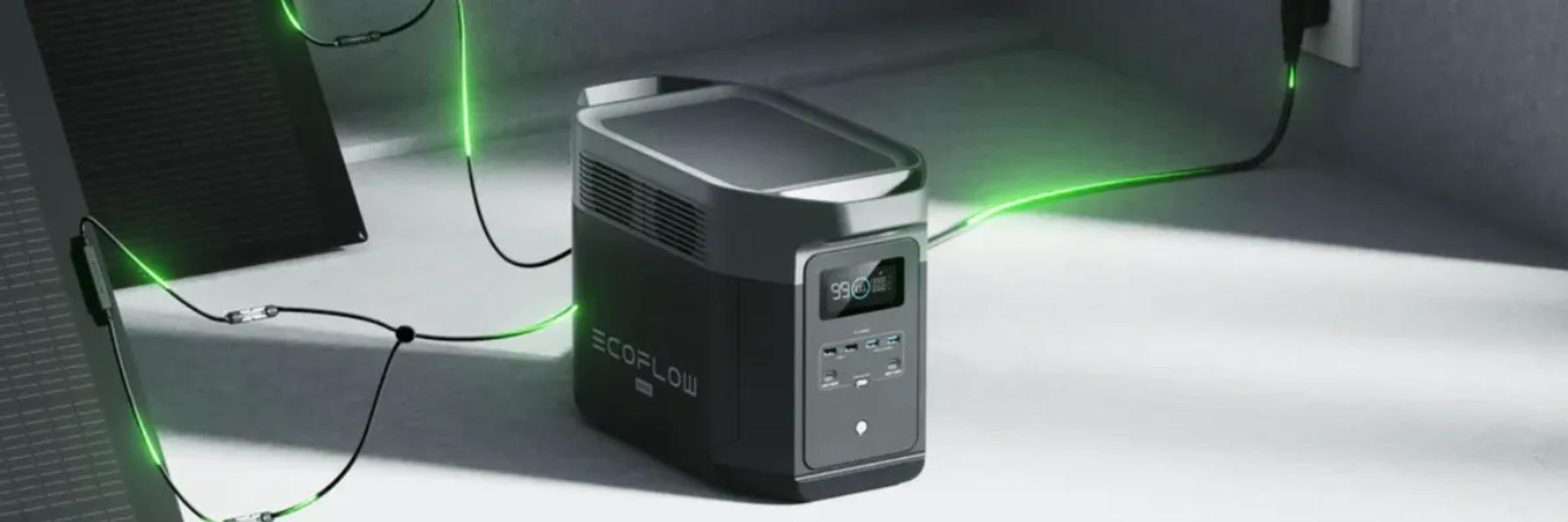 - Зарядка аккумулятора от розетки, автомобильного прикуривателя или солнечных панелей. Экофлоу использует литий-ионные аккумуляторы большой емкости, способные накапливать достаточно энергии для питания даже таких мощных бытовых приборов, как холодильники или обогреватели.