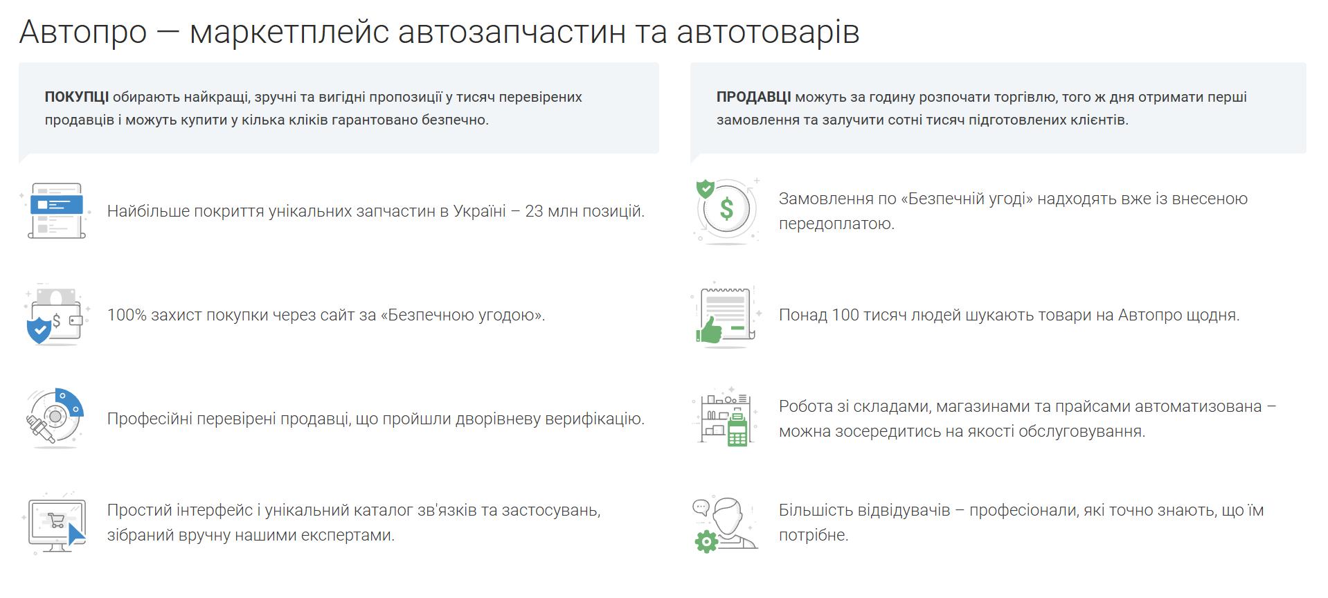 Avto.pro – популярний маркетплейс автозапчастин. Це спеціалізована онлайн-площадка, де продаються виключно автотовари. За весь час існування на ринку запчастин Автопро завоювання довіри мільйонів автолюбителів. Сайт кожен місяць відвідує більше 3 млн користувачів. Над платформою працює команда професіоналів, яка розробила унікальний каталог і зробила все можливо, щоб майданчик стала лідером ринку.